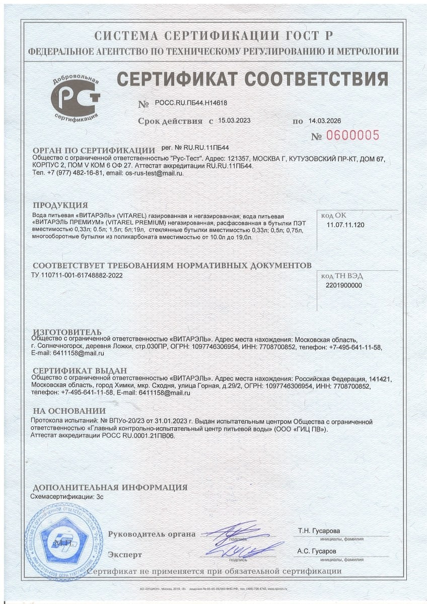 За качеством очистки и содержанием микроэлементов следит сертифицированная лаборатория. Поэтому артезианскую воду "Vitarel" можно пить без кипячения.