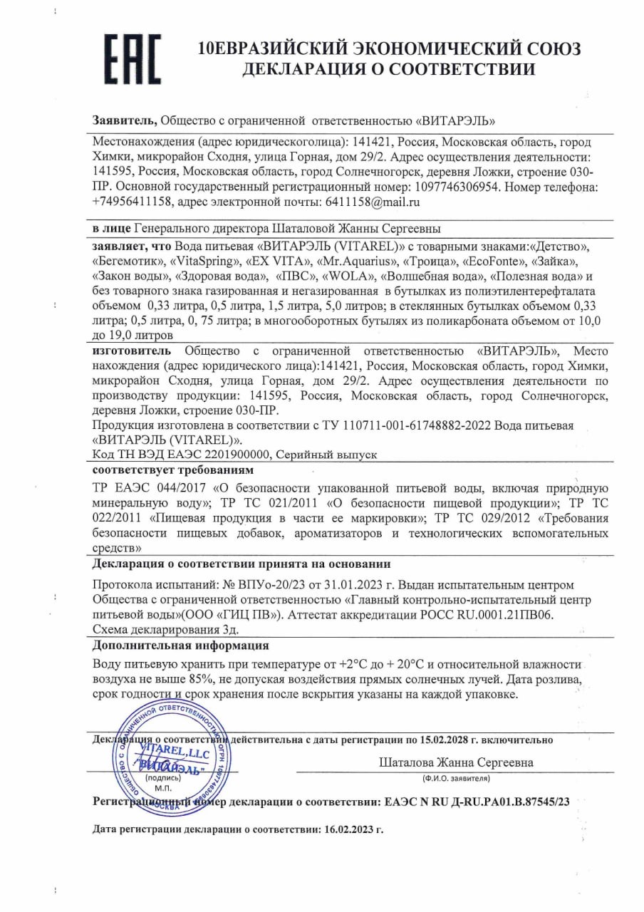 За качеством очистки и содержанием микроэлементов следит сертифицированная лаборатория. Поэтому артезианскую воду "Vitarel" можно пить без кипячения.